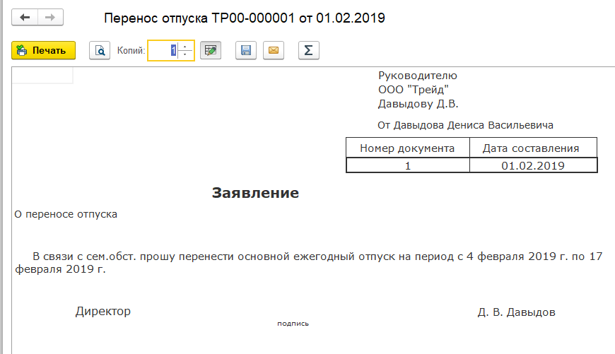 Проведем документ. Выведем на печать заявление о переносе отпуска