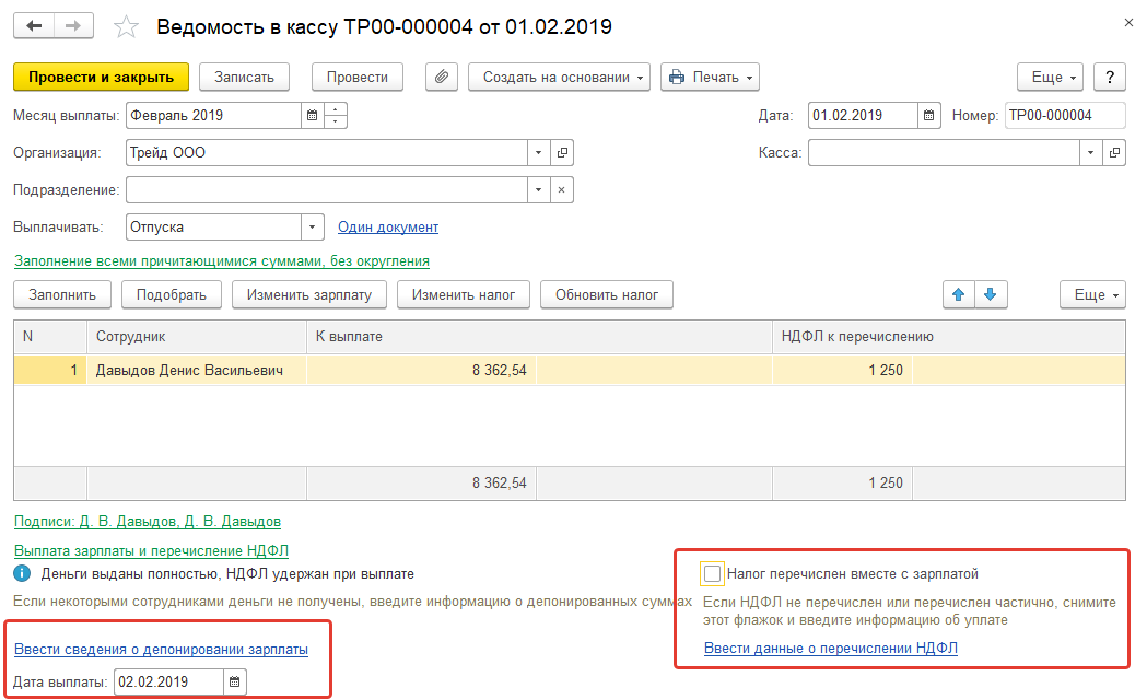 - представим, что ведомость была подготовлена 01.02.19, однако реальная выдача денег состоялась 02.02.19. Пользователь хочет сохранить обе даты (и дату подготовки ведомости, и дату выплаты). Уточним по ссылке "Выплата, перечисление НДФЛ" дату выдачи – 02.02.2019;
