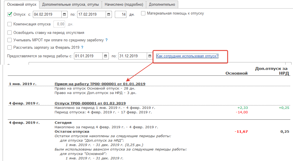 - Основной отпуск. При этом указывается период отпуска, рабочий год, за который он предоставлен. По ссылке "Как сотрудник использовал отпуск?" можно просмотреть справку по отпуску.