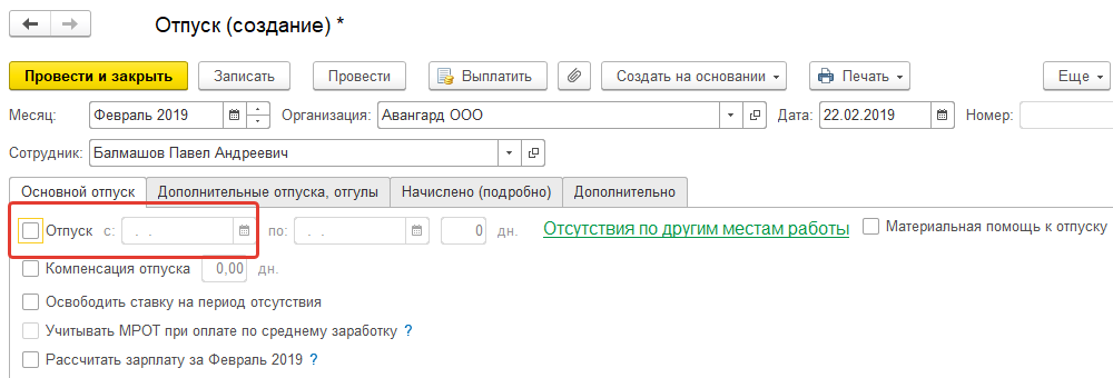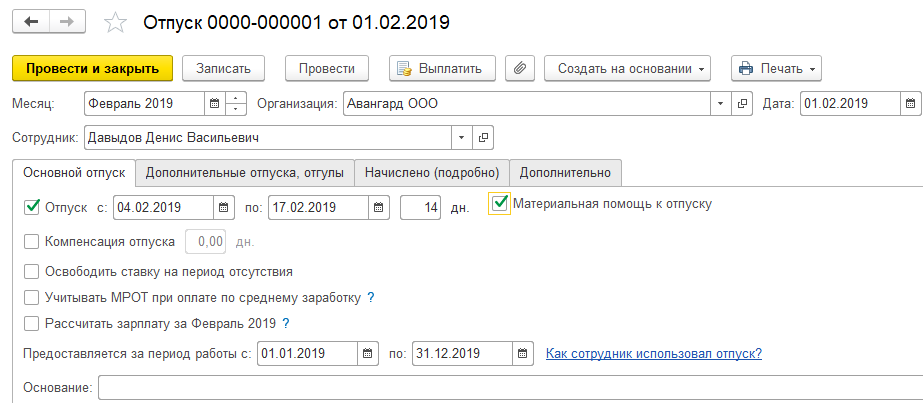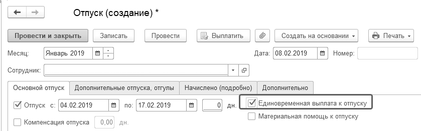 Если отпуск создается без графика отпусков, то следует перейти в раздел "Зарплата/ Отпуска" к списку документов и добавить новый документ "Отпуска" вручную. Месяц начисления – февраль, сроки 04.02. по 17.02. При необходимости уточним дату приказа, а также дату выплаты НДФЛ (01.02.). Материальная помощь к отпуску в ООО "Трейд" не предоставляется.