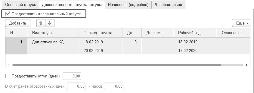 Также на этой закладке имеется возможность предоставить отгул сотруднику, присоединив его отпуску.