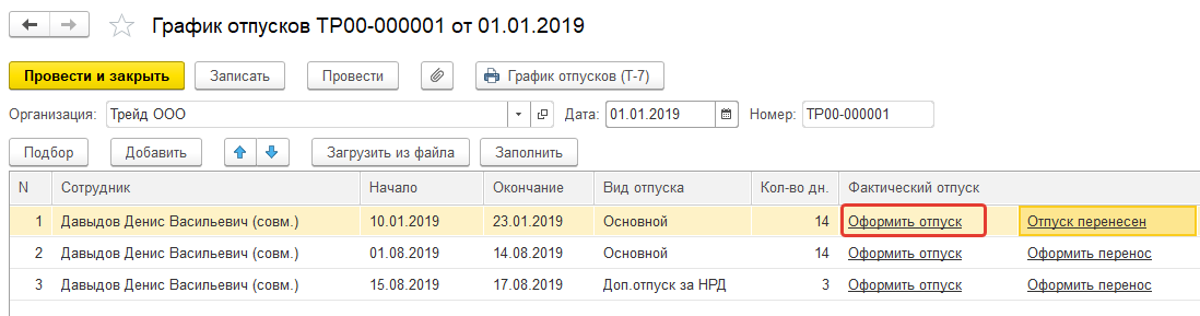 Если выполнялись задания по настройке графика отпусков, то приказ на отпуск можно создать на основании графика отпусков.