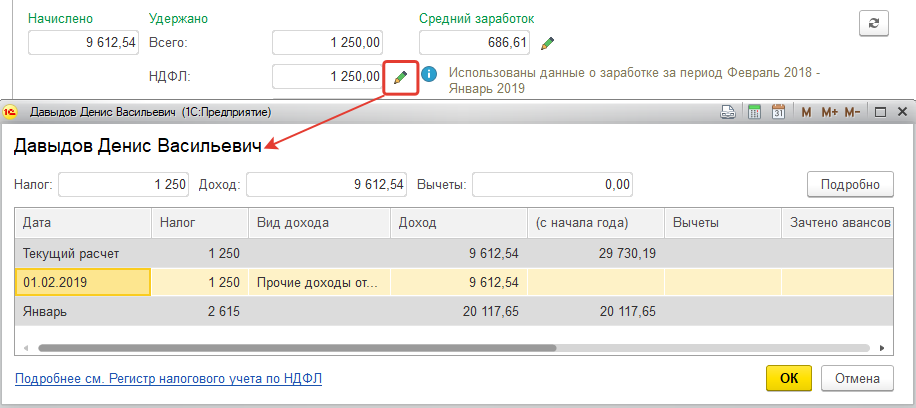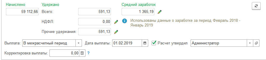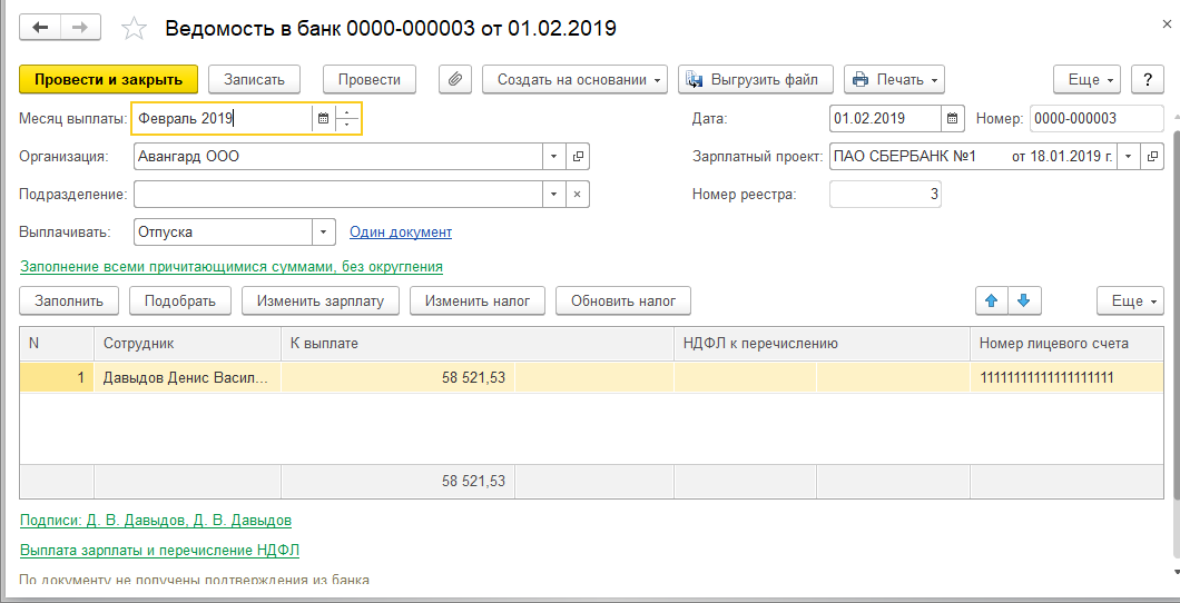 Доход и НДФЛ исчисленный зарегистрированы по дате выплаты, указанной в документе, т.е. 01.02.2019 (эта дата будет учитываться при заполнении отчетной формы 6-НДФЛ, если дата ведомости на выплату будет отличаться, то к учету будет приниматься дата выплаты).