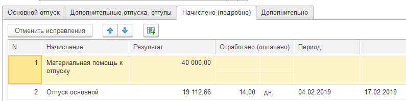 На закладке "Основной отпуск" определяется, что будет начислено сотруднику:
