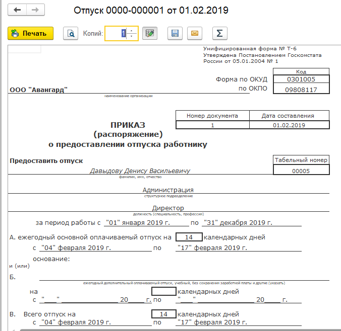 Также из формы документа выводится на печать приказ на отпуск по форме Т-6а. Обратите внимание на то, что документ не имеет режима проведения, а только записывается.