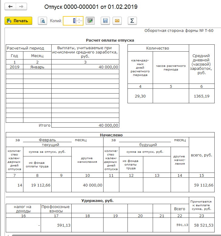 Проанализируйте самостоятельно расчет суммы отпускных и суммы налога, выведите на печать унифицированные печатные формы Т-6 и Т-60.