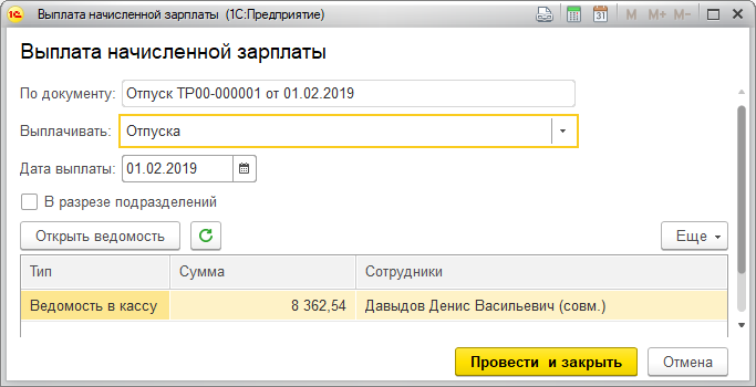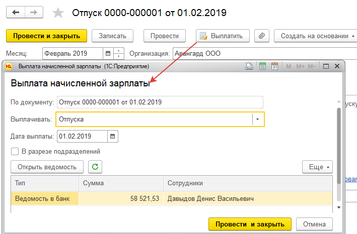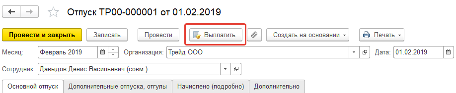 2. Выплатим рассчитанные отпускные сотруднику ООО "Авангард" Давыдову Д.В. 01.02.19. Для этого в "его" документе "Отпуск" нажмем команду "Выплатить".