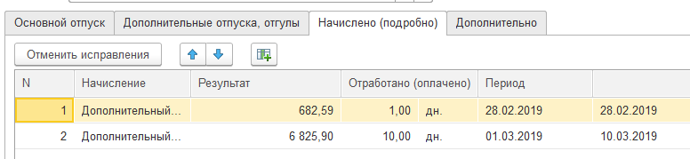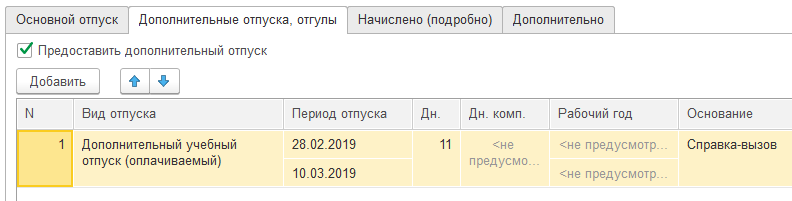 Дату выплаты для НДФЛ укажем 22.02.2019 – отпускные начислены и выплачены заранее до февральских праздников. Сроки отпуска с 28.02. по 10.03 Сведения об учебном отпуске заполняются на закладке "Дополнительные отпуска"