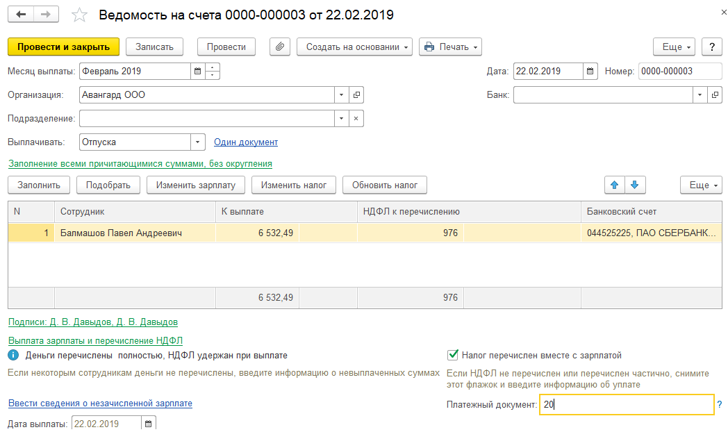 Выплатим отпускные сотруднику по ведомости перечислений на счета. Дата документа – 22.02.2019.