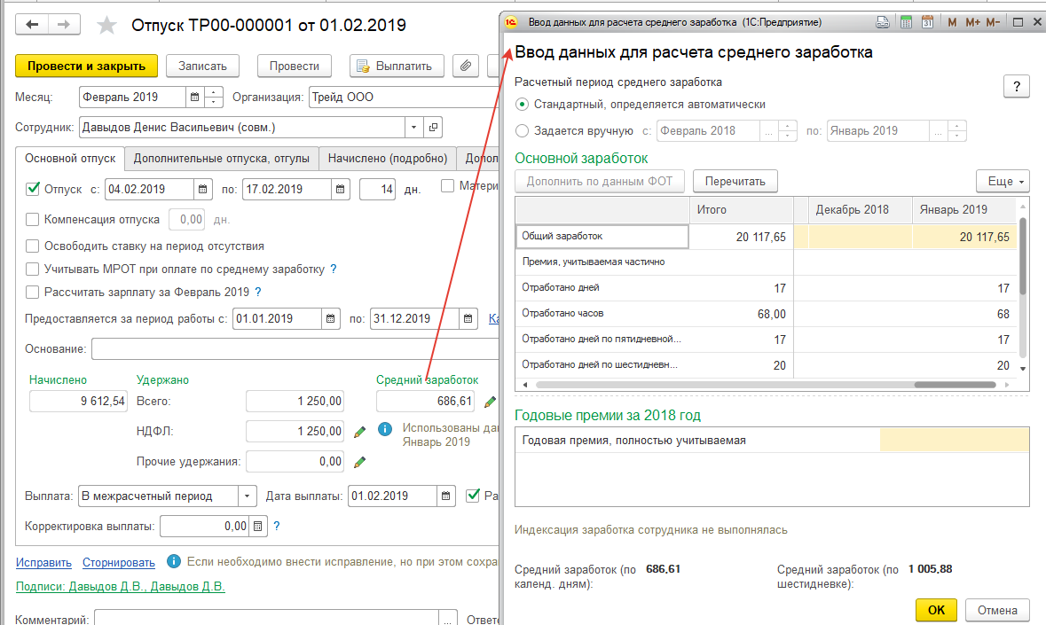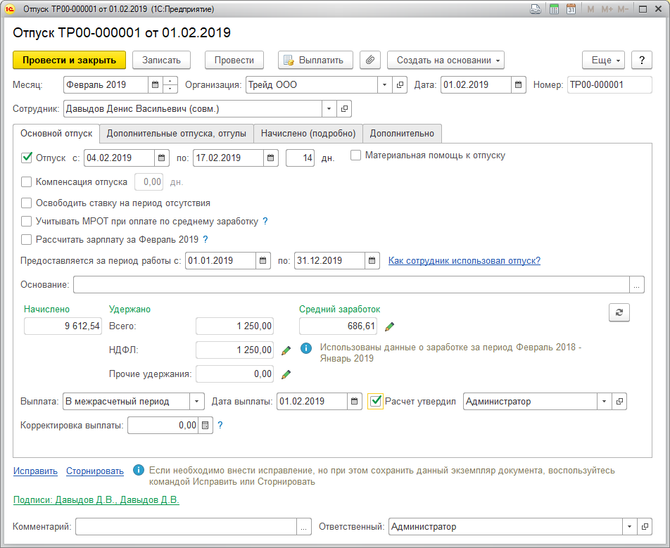 Начислим в феврале отпускные сотруднику ООО "Трейд" Давыдову Д.В.