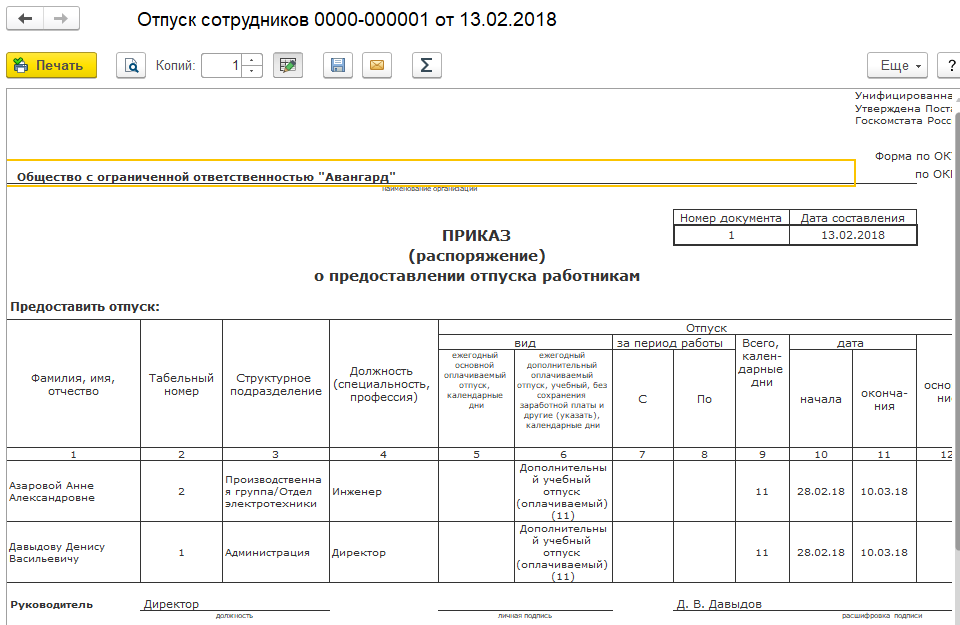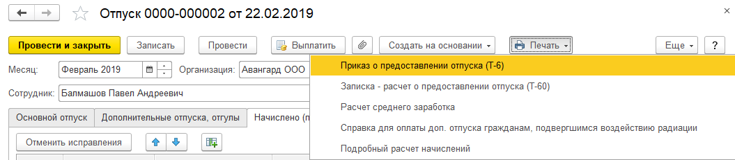 Из формы документа можно распечатать документы, предназначенные для документального подтверждения отпуска.