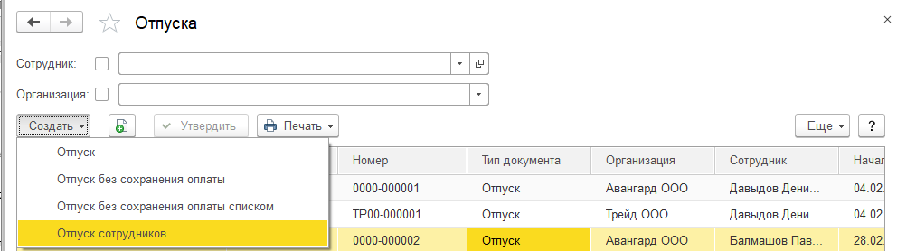Данным документом на текущий момент также можно регистрировать и неоплачиваемые отпуска, однако для этих целей все же предусмотрен документ "Отпуска без сохранения зарплаты". Документ также можно ввести на основании графика отпусков (по ссылке "Оформить отпуск" - см. выше).
