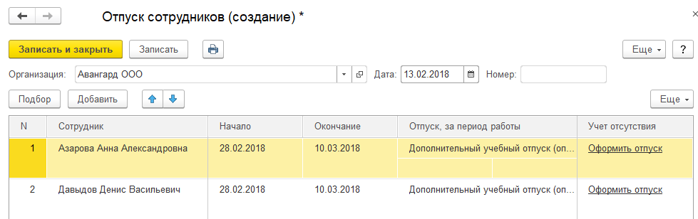Документы по отпускам, рассмотренные выше, создаются индивидуально на одного сотрудника. Для сотрудников отделов кадров иногда требуется оформить группой приказ на нескольких сотрудников.