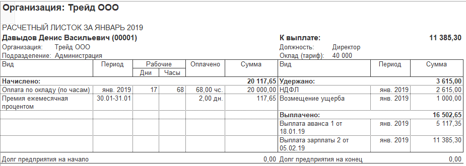 За январь 2019г. сотруднику начислена зарплата: оплата по окладу+премия = 20 117,65 руб. (оба начисления включаются в состав базы по среднему заработку). Месяц отработан полностью. Эту информацию можно увидеть, например, в расчетном листке за январь 2019г.
