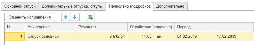 2) Проанализируем расчет начислений на закладке "Начислено (подробно)". Для расчета оплаты отпуска среднедневной заработок умножается на количество дней отпуска: 686,61*14 = 9 612,54 руб.
