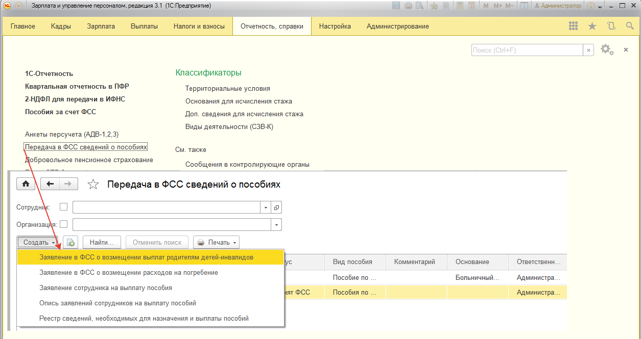 - В разделе "Отчетность, справки / Передача в ФСС сведений о пособиях".