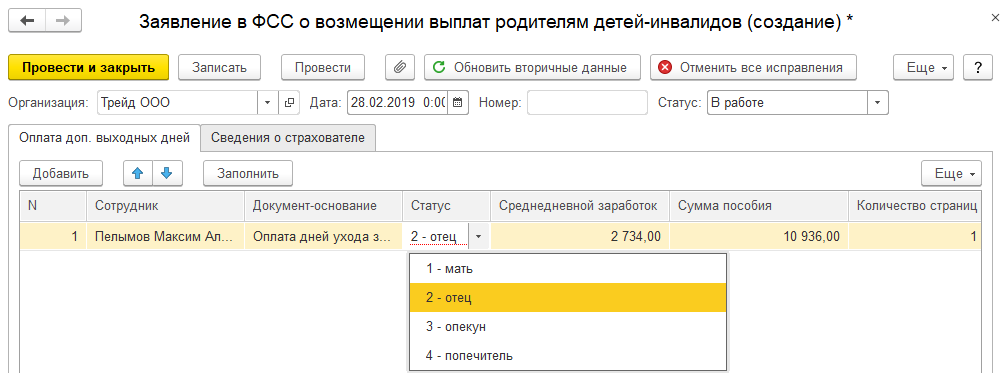 Документ можно заполнить автоматически по команде "Заполнить" всеми первичными документами, на которые еще не созданы заявления, либо вручную. На закладке "Оплата доп. выходных дней" заполняются сотрудники и информация из первичного документа о расчете сумм пособия. При этом необходимо уточнить статус сотрудника по отношению к ребенку-инвалиду.