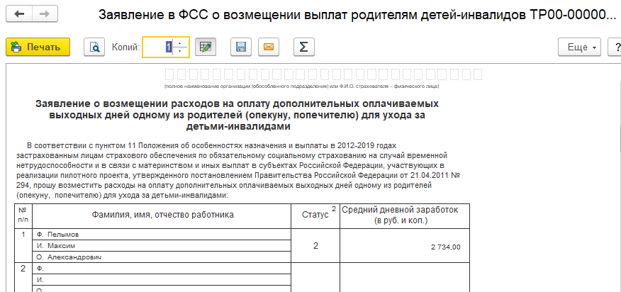 Для реализации данной задачи в программе предусмотрен документ "Заявление в ФСС о возмещении выплат родителям детей-инвалидов".