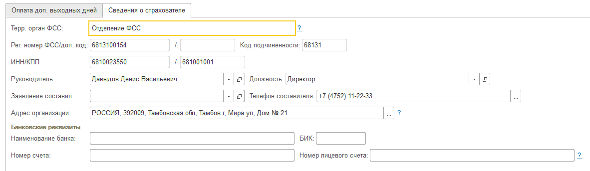 На закладке "Сведения о страхователе" заполняются сведения об организации.