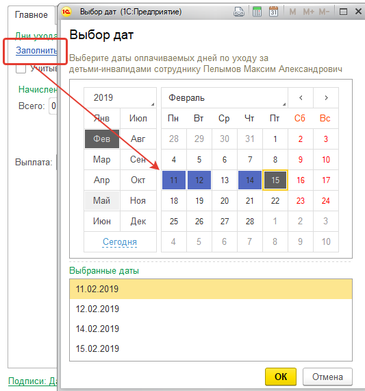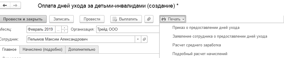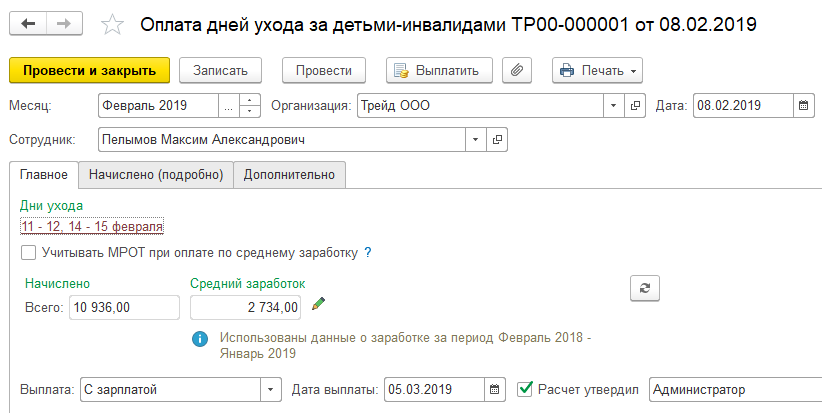 Сотруднику ООО "Трейд" Пелымову М.А. предоставлены четыре дня по уходу за детьми-инвалидами: 11, 12, 14 и 15 февраля. Из раздела "Зарплата/ Все начисления" создадим документ "Оплата дней по уходу за детьми-инвалидами".