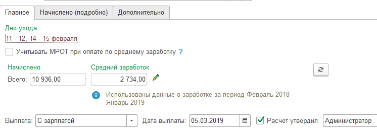 Также на закладке "Главное" отображается средний заработок, начисленные суммы и настраивается порядок выплаты сумм по документу.
