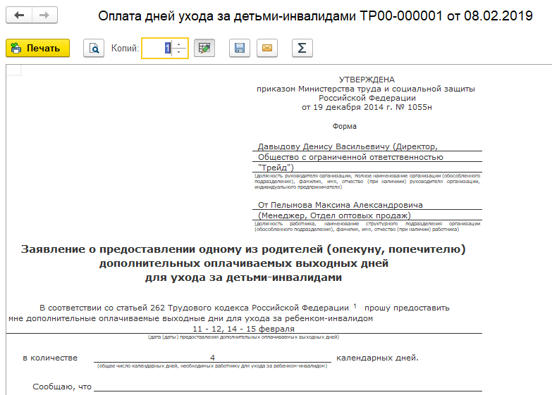 Выведем на печать приказ и заявление сотрудника о предоставлении дней ухода.