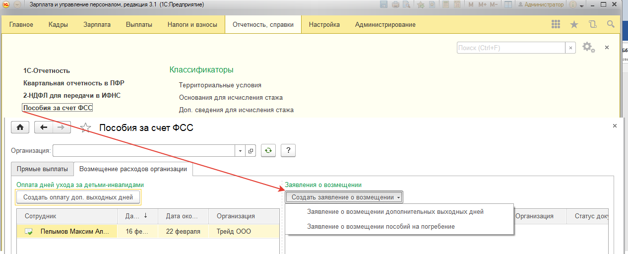 Напомним, что организации, которые участвуют в пилотном проекте ФСС по прямым выплатам, могут начислять пособия по уходу за детьми-инвалидами и социальные пособия на погребение, а затем подавать заявления на возмещение сумм из ФСС. Рассмотрим, как отразить данную ситуацию в программе на примере дней ухода за детьми-инвалидами.