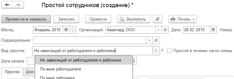 Простои могут быть оплачиваемые и неоплачиваемые. В программе существует возможность регистрировать любой вид простоя документом "Простои сотрудников", если выбрана соответствующая возможность в настройках программы.