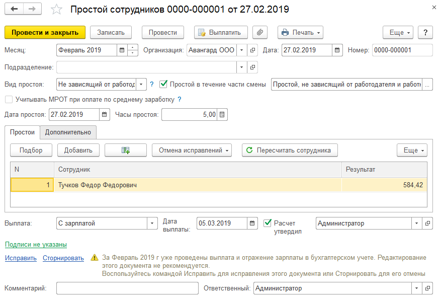 Сотруднику ООО "Авангард" Тучкову Ф.Ф. (по основному месту работы) оформлен простой, по причинам, не зависящим от работодателя и работника, на 27.02.2019 на 5 часов. Отразим ситуацию в программе.