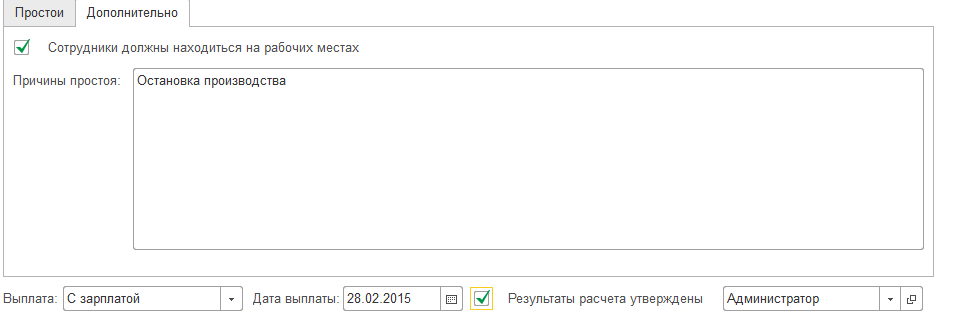 На закладке "Дополнительно" указываются причины простоя, а также необходимость находится сотрудникам на рабочих местах.