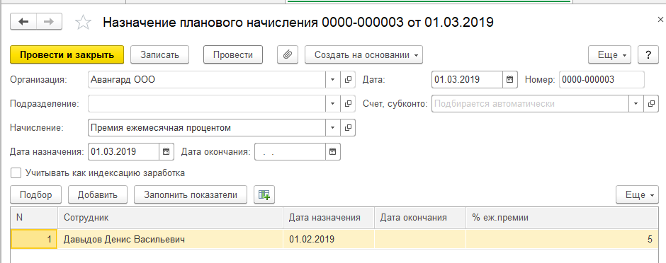 Сотруднику ООО "Авангард" Давыдову Д.В. была назначена премия ежемесячная процентом с 01.02.2019. Однако в программу эту информацию вовремя не ввели. В марте необходимо доначислить премию сотруднику. Для этого введем постоянное начисление документом "Назначение планового начисления" с 01.02.2019: назначим премию в размере 5% (обратите внимание на то, что подобный ввод данных возможен только при неустановленной дате запрета изменения прошлых периодов в данном месяце).