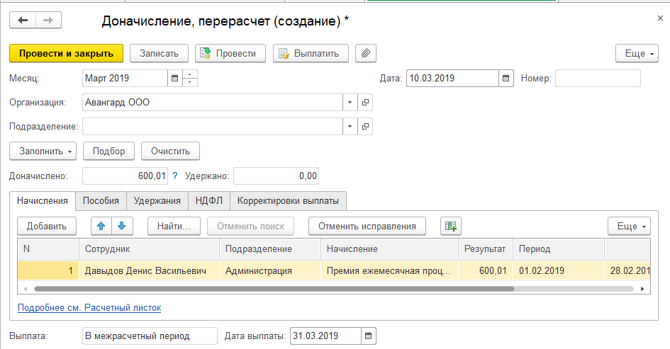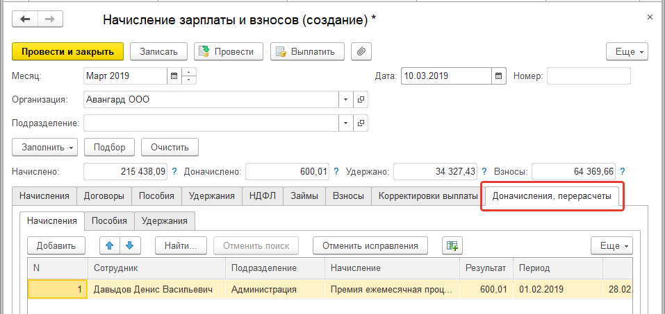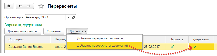 Теперь необходимо выполнить перерасчет зарплаты за февраль по данному сотруднику.