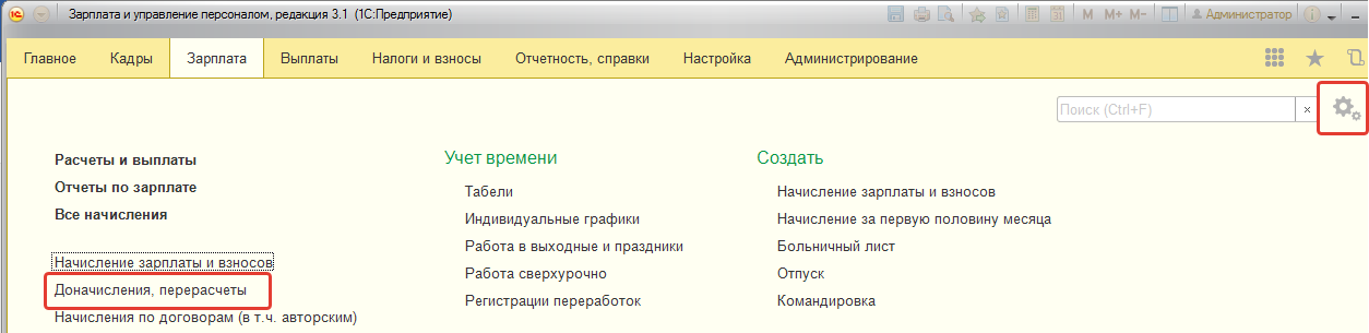 Вариант 2. Если же в настройке расчета зарплаты программы отмечен флаг "Выполнять доначисление и перерасчет отдельным документом" либо пользователю необходимо выполнить перерасчет в течение расчетного периода (месяца) отдельно от основной зарплаты, то создается отдельный документ "Доначисления, перерасчеты".