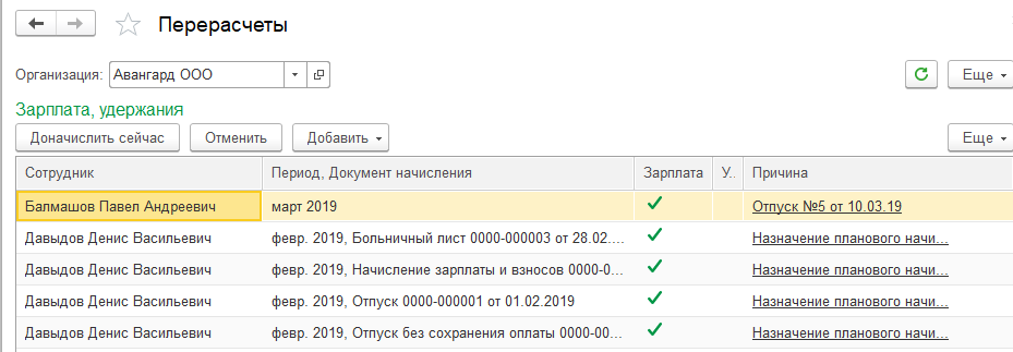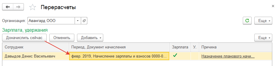 Чтобы провести доначисление, необходимо нажать команду "Доначислить сейчас" - будет создан документ "Доначисления, перерасчеты".