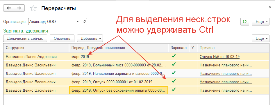 Обратите внимание, что в обработку можно добавлять перерасчеты начислений и удержаний дополнительно и вручную.