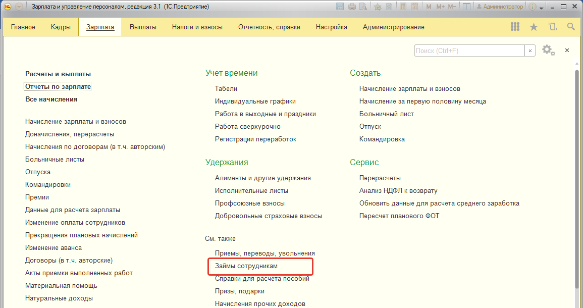 Доступ к документам осуществляется из раздела "Зарплата / Займы сотрудникам" (либо в карточке сотрудника).