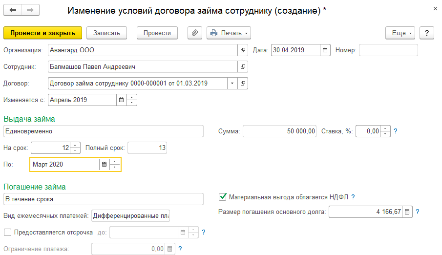 Если в течение срока действия договора займа, его условия изменяются, следует ввести документ "Изменение условий займа".