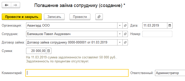 В документе указывается сотрудник, договор займа, сумма, которую погашает сотрудник. При этом можно увидеть сумму задолженности по договору на дату ввода документа. Расчет материальной выгоды и процентов при начислении зарплаты будет производиться с учетом погашенных сумм.