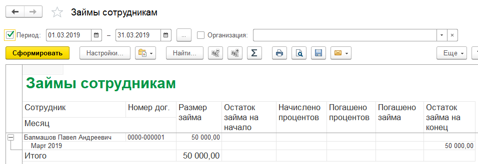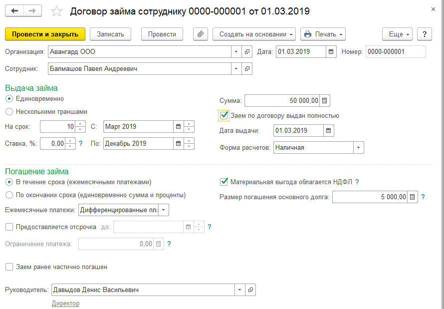 Если заем по договору выдан не полностью, следует ввести документ "Выдача займа". Документ может вводиться на основании договора займа либо на основании карточки сотрудника.