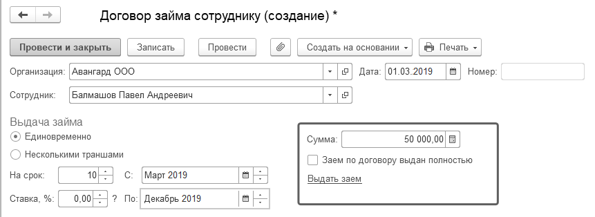 Если выдача займа осуществляется единовременно, то в документе указывается сумма займа. Также можно установить флаг, что заем выдан полностью, и указать дату выдачи. В противном случае для выдачи займа регистрируется отдельный документ "Выдача займа".