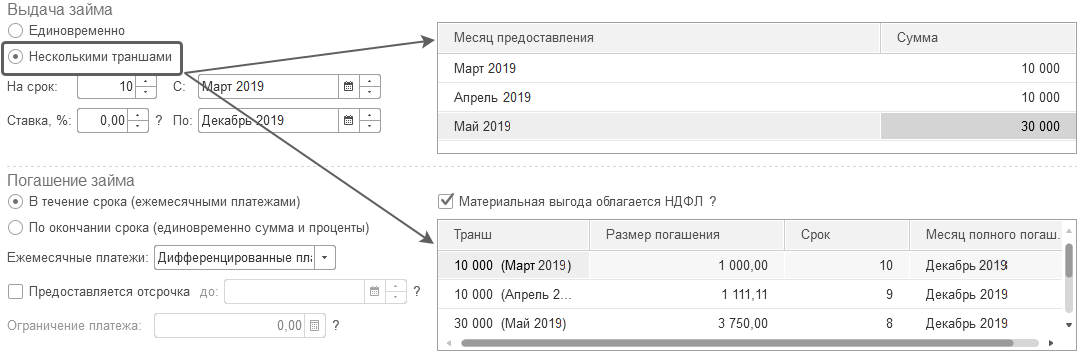Если выдача займа осуществляется отдельными траншами, то в документе указываются месяцы получения траншей и суммы выдачи.