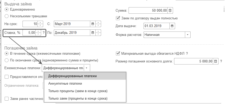 Если заем выдается беспроцентный или размер процентов меньше ставки рефинансирования ЦБ РФ, то возникает материальная выгода, облагаемая НДФЛ. Для автоматического расчета материальной выгоды устанавливается соответствующий флаг. Датой возникновения материальной выгоды считается дата уплаты процентов, т.е. дата начисления зарплаты. Соответственно расчет материальной выгоды производится при начислении зарплаты.