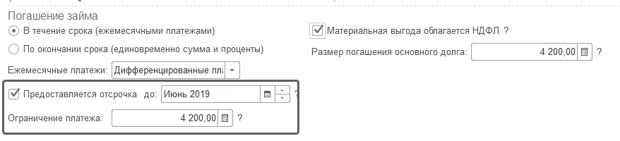 По займу может предоставляться отсрочка – в этом случае следует указать, с какого месяца начнется погашение займа, а также ограничение платежа после отсрочки.