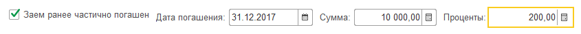 Если ранее заем был уже частично погашен (например, вводится продолжение договора займа, рассчитывавшегося в другой программе), можно установить флаг "Заем частично погашен" и указать сумму и проценты по займам.