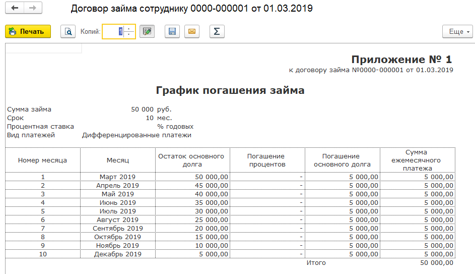 Заем выдается в размере 50 000 руб. на 10 месяцев – с марта по декабрь.