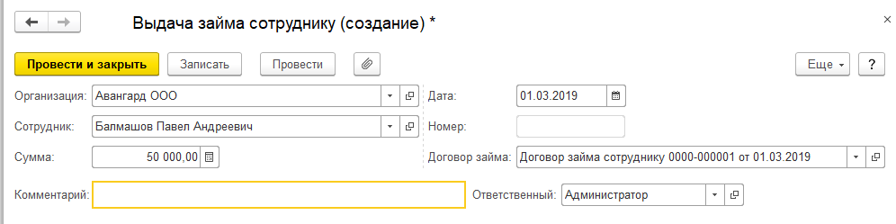 Документ может вводиться на основании договора займа либо на основании карточки сотрудника.
