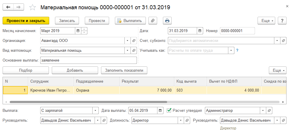 Сотруднику ООО "Авангард" Крючкову И.П. в марте выдали материальную помощь на сумму 7000 руб. Из раздела "Зарплата/ Все начисления" создадим документ "Материальная помощь" и заполним его следующими условиями (обратите внимание, что вычет должен рассчитаться автоматически):