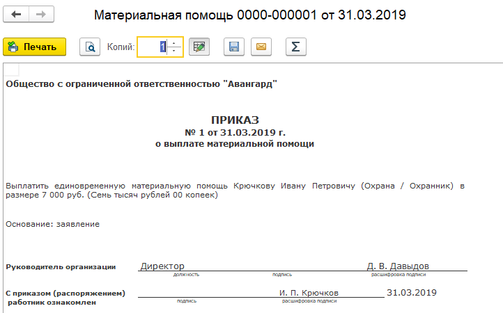 Проведем документ. Выведем на печать приказ о выдаче материальной помощи.