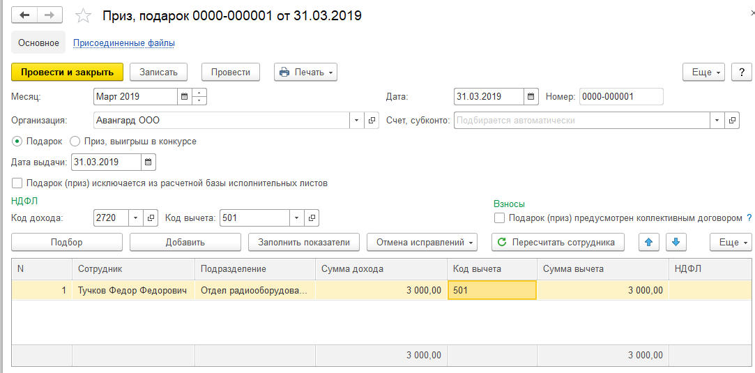 В документе переключателем устанавливается характер выдаваемого дохода (подарок или приз). В зависимости от этого доступны определенные коды дохода НДФЛ. К коду дохода НДФЛ может быть указан вычет, если вычет полагается сотруднику, то он будет рассчитываться автоматически.