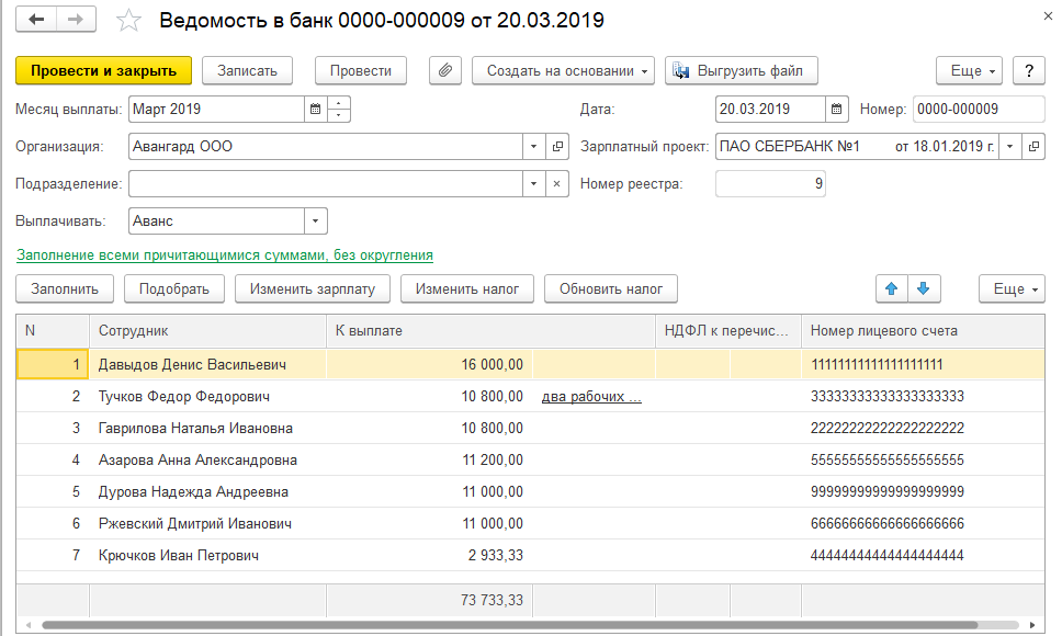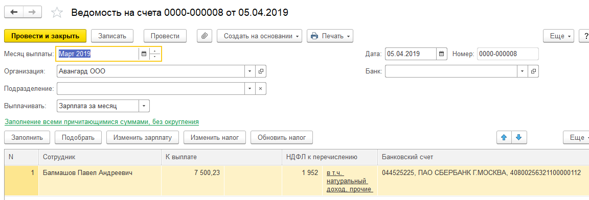 Выплатим зарплату через банк и на лицевые счета 05.04.2019, реквизиты документов по уплате НДФЛ № 89. Документы на выплату можно создать на основании начисления зарплаты.